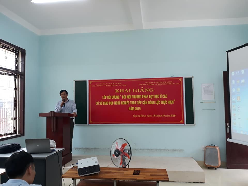 Thực hiện Kế hoạch số 964 /KH-SLĐTBXH , ngày 19 tháng 78 năm 2018của Sở Lao động -Thương binh và Xã hội về tổ chức bồi dưỡng nhà giáo, cán bộ quản lý GDNN năm 2019 , ngày 18/10/2019 trại Trung tâm Dịch vụ việc làm Quảng Bình Sở Lao động TB&XH phối hợp với Trường Đại học Sư phạm Kỹ thuật Vinh tổ chức lớp  bồi dưỡng “Đổi mới phương pháp dạy học ở các cơ sở giáo dục nghề nghiệp theo tiếp cận năng lực thực hiện” năm 2019   cho đội ngũ cán bộ quản lý và nhà giáo của các cơ sở GDNN trên địa bàn