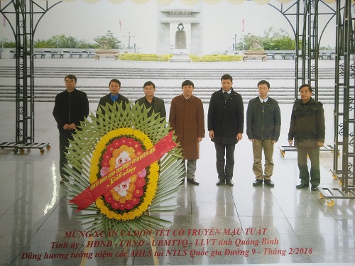 Thực hiện Thông báo số 104/TB-UBND ngày 23/01/2018 của Ủy ban nhân dân tỉnh về chương trình tổ chức các hoạt động đón Tết Nguyên đán Mậu Tuất năm 2018, sáng ngày 06/02/2018, Đoàn Đại biểu tỉnh Quảng Bình do đồng chí Trần Tiến Dũng, Tỉnh ủy viên, Phó Chủ tịch Ủy ban nhân dân tỉnh làm Trưởng đoàn đã đến đặt vòng hoa, thắp hương viếng Nghĩa trang Liệt sĩ Quốc gia Trường Sơn và Nghĩa trang Liệt sĩ Quốc gia Đường 9, tỉnh Quảng Trị, Đền tưởng niệm các anh hùng liệt sĩ Bến phà Long Đại, xã Hiền Ninh, huyện Quảng Ninh.