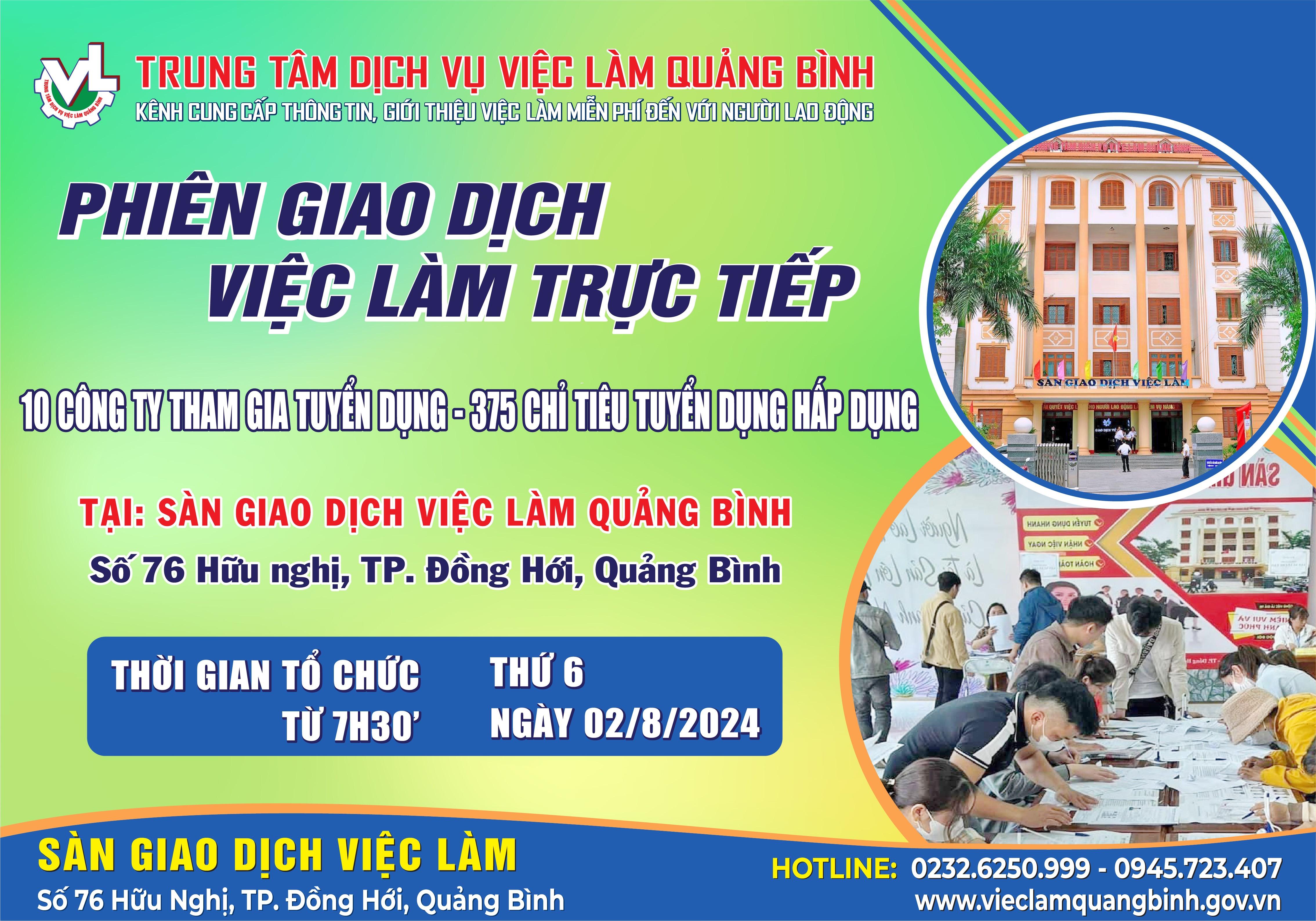 Trung tâm Dịch vụ việc làm Quảng Bình thông báo Phiên GDVL lần thứ nhất năm 2025 được tổ chức phỏng vấn trực tiếp vào lúc 7h30’ ngày 03/01/2025 (Thứ 6) tại Sàn Giao dịch việc làm Quảng Bình,..