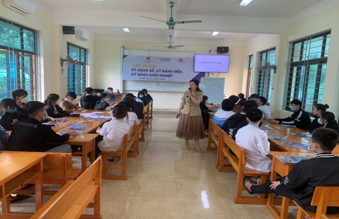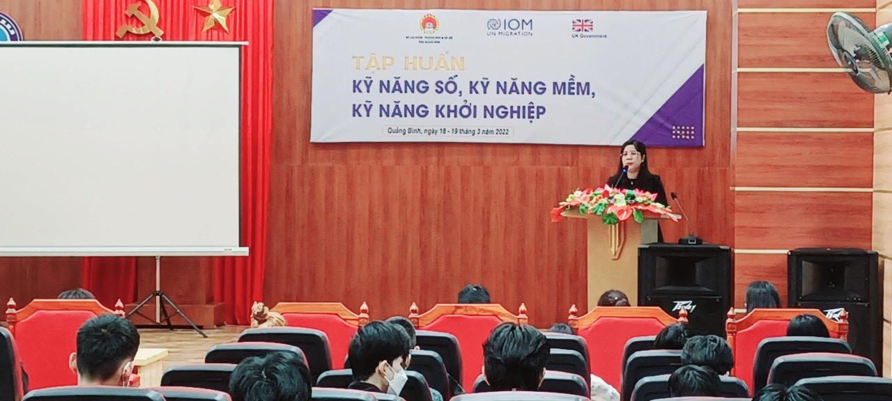 Ngày 18/3/2022, Sở Lao động – Thương binh và Xã hội tỉnh Quảng Bình phối hợp cùng Phái đoàn Tổ chức Di cư Quốc tế (IOM) tại Việt Nam tổ chức tập huấn cho các đối tượng là học sinh, sinh viên tại Trường Trung cấp Du lịch – Công nghệ số 9 về kỹ năng số, kỹ năng mềm, kỹ năng khởi nghiệp, nhằm tăng cường khả năng tiếp cận các cơ hội học nghề, việc làm và sinh kế cho người có mong muốn di cư và người di cư trong hoàn cảnh dễ bị tổn thương, dễ trở thành nạn nhân mua bán người.