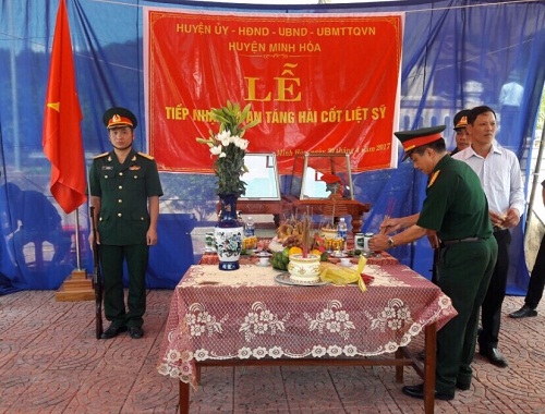 Với tấm lòng thành kính và biết ơn sâu sắc đối với sự hy sinh to lớn của các anh hùng liệt sỹ cho sự bình yên của Tổ quốc, lễ đón nhận và an táng hài cốt các liệt sỹ tại 02 địa phương đã diễn ra thật trang nghiêm và đầy xúc động, cùng với sự tham gia dự của Bộ chỉ huy Quân sự tỉnh, Sở Lao động - Thương binh và Xã hội và đại diện lãnh đạo, các ban, ngành, đoàn thể, lực lượng vũ trang của thành phố Đồng Hới cũng như huyện Minh Hóa.