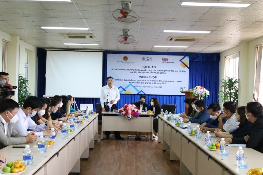 Ngày 1/4/2022, Sở Lao động – Thương binh và Xã hội tỉnh Quảng Bình phối hợp cùng Phái đoàn Tổ chức Di cư Quốc tế (IOM) tại Việt Nam tổ chức hội thảo tổng kết dự án, trao đổi, chia sẻ nhằm tìm phương hướng lồng ghép, nhân rộng các khóa học về kỹ năng số, kỹ năng mềm và kỹ năng khởi nghiệp, nâng cao hiệu quả công tác học tập, kết quả đầu ra của các cơ sở giáo dục nghề nghiệp nhằm nâng cao cơ hội nghề nghiệp cho các học sinh, sinh viên trên địa bàn tỉnh Quảng Bình.