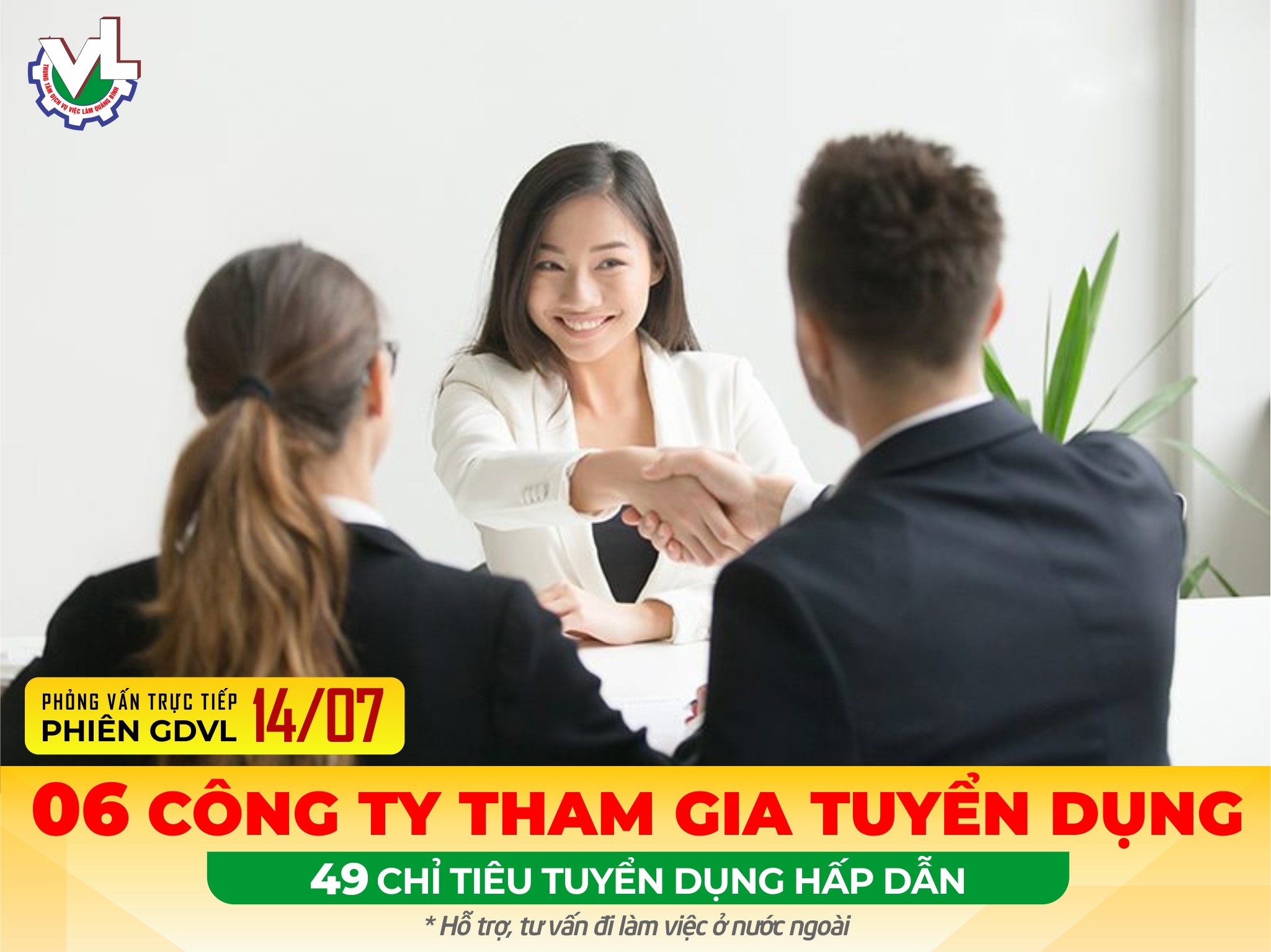 Trung tâm Dịch vụ việc làm Quảng Bình thông báo Phiên GDVL lần thứ 19 năm 2023 được tổ chức phỏng vấn trực tiếp vào lúc 7h30’ ngày 14/07/2023 tại Sàn Giao dịch việc làm Quảng Bình,