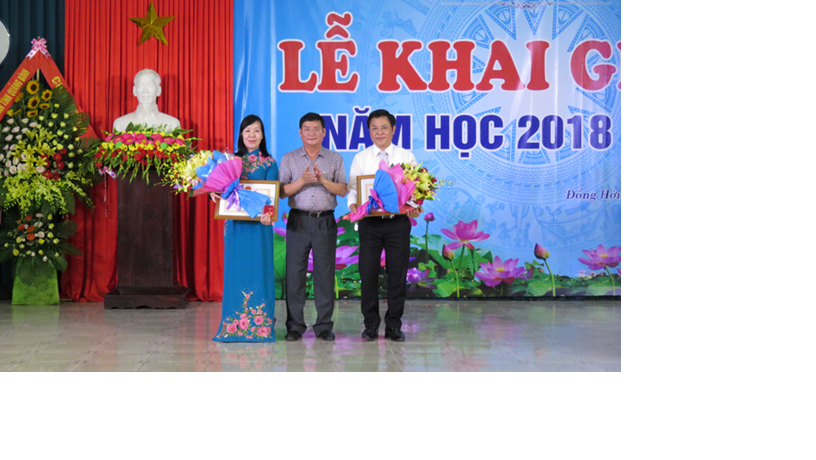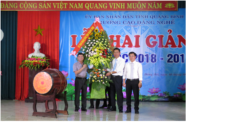Đồng chí Trần Tiến Dũng, Tỉnh uỷ viên, Phó Chủ tịch UBND tỉnh đánh trống khai giảng và tặng hoa chúc mừng năm học mới của Trường CĐ nghề Quảng Bình.
