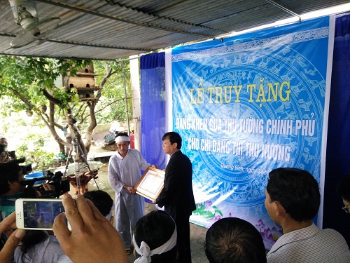 Thứ trưởng Nguyễn Trọng Đàm đã trao Bằng khen của Thủ tướng Chính phủ cho chị Đặng Thị Thu Hương vì đã có thành tích trong hoạt động từ thiện, nhân đạo. Thay mặt gia đình, ông Đặng Văn Dũng, ba của chị Đặng Thị Thu Hương nhận Bằng khen của Thủ tướng.