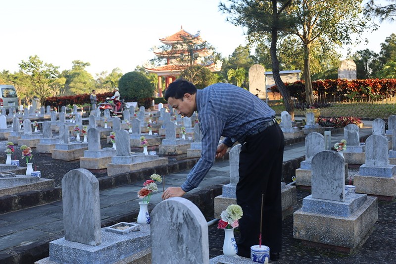 Với tấm lòng thành kính và tri ân sâu sắc đối với công lao to lớn của các anh hùng liệt sỹ đã cống hiến tuổi thanh xuân, dũng cảm chiến đấu, hy sinh vì độc lập, tự do và thống nhất đất nước; Đoàn dâng hương, dâng hoa và kính cẩn thắp hương trên từng phần mộ của các liệt sỹ.